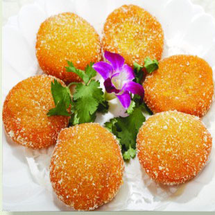 3、鍋內(nèi)注入清油,待油溫升至120℃時,把南瓜餅放在漏勺內(nèi)入油中用小火浸炸,至南瓜餅膨脹,撈出待油溫再升至160℃時下餅炸至發(fā)脆時即好。這樣就好了。